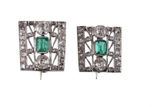 The slightly tapered square brooches with a central alternating row of old cut diamonds and step cut emeralds, to pierced scrolled rose cut diamond sections and rose cut diamond borders, unmarked, later brooch fittings