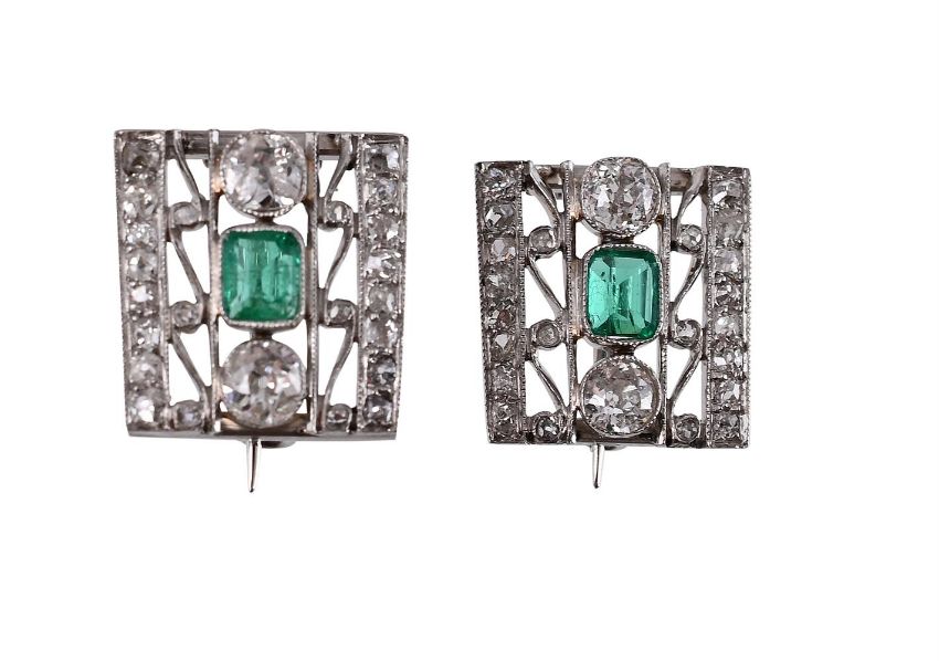 TWO CONVERTED EMERALD AND DIAMOND BROOCHES