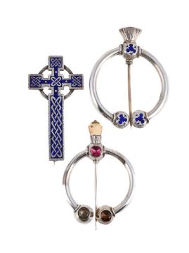 SCOTTISH INTEREST: TWO VICTORIAN SILVER PENANNULAR CLOAK PINS AND A CELTIC CROSS BROOCH