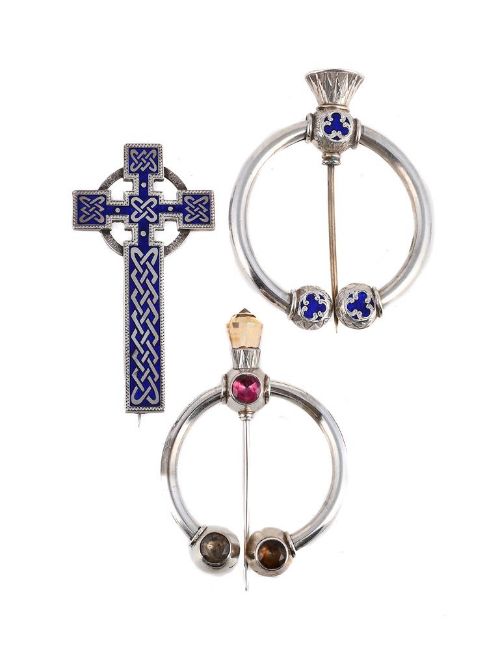 The first brooch with decorative blue enamelled terminals and thistle shaped sliding pin, unmarked; the second with foil backed circular facetted hardstones, to a pink foiled hardstone and facetted citrine thistle shaped sliding pin, unmarked; and a blue enamelled Celtic cross brooch, decorated with Celtic knots, unmarked