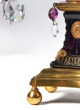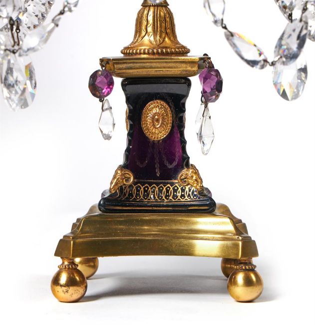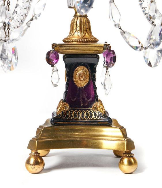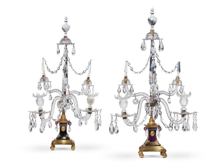 A PAIR OF GEORGE III GILT BRONZE MOUNTED CUT GLASS CANDELABRA BY PARKER & PERRY, LATE 18TH CENTURY Each with two candle branches hung with facetted drops on a waisted parcel gilt amethyst glass plinth Each 68cm high, 38cm wide, 26cm deep Condition Report: The glass will late 18th century and later. Small chips and losses, some drops will need replacing and some have been replaced (to be expected). Wear to gilding of blue glass bases. Please see additional images available from the Dept. upon request. These should help clarify....Condition Report Disclaimer