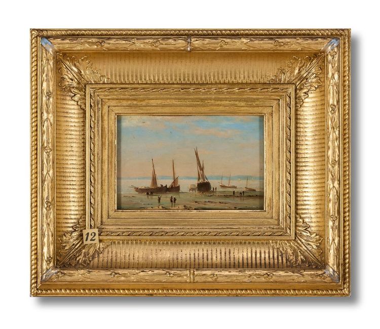 HENRIETTE GUDIN (FRENCH 1825 - 1892) COASTAL SCENE WITH BEACHED FISHING BOATS AND FISHER FOLK ON THE SHORE Oil on panel Indistinctly signed (lower left) 12.5 x 21cm (4¾ x 8¼ in.)