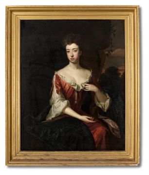 AFTER SIR GODFREY KNELLER PORTRAIT OF LADY LUCY BOOTH Oil on canvas laid to board 125 x 100cm (49 x 39¼ in.) Provenance: Possibly commissioned by John Robartes, 1st Earl of Radnor for Llanhydrock, Cornwall Inherited by Lady Isabella Legh, nee Robartes or Charles Legh Thence by descent at Adlington Hall Literature: Another version at Llanhydrock https://www.nationaltrustcollections.org.uk/object/884941 Lady Lucy Booth, nee Robartes (unknown-1717), was the sister of Lady Isabella Legh née Robartes (1674-1725) and Charles Bodvile Robartes, 2nd Earl of Radnor (1653-1723), and the daughter of Robert Robartes, Viscount Bodmin (1634-82), and Sarah Bodvile, later Countess of Radnor (1640-1720). She married George Booth Esq. the brother of Henry Booth, 1st Earl of Warrington. Another version of this painting can be found at Lanhydrock, Cornwall. It has previously been suggested that the sitter could be Mary Oldbury, Countess of Warrington (circa 1680-85 - 1740), Lucy's sister in law, but a label on the back of the Lanhydrock version would suggest that Lucy is a more likely candidate.The present portrait most likely entered the Legh collection following the marriage of Lady Isabella Robartes (1674-1725) to John Legh of Adlington Hall in 1693. Alternatively, it is conceivable that it could have been retained at Llanhyrdrock but later gifted to the Legh family upon the death of their cousin, the 3rd Earl of Radnor, in 1741 when the Radnor title and Llanhydrock were separated: the title succeeded by distant cousin and the house, believe by antiquarian John Loveday to be in a sorry state, bequeathed to a nephew. Condition Report: Oil on canvas laid to board. Craquelure throughout, together with some bitumen separation in the darker pigments in the lower half of the canvas. Rubbing and abrasions to the framing edges. Some superficial surface scratches throughout including one larger scratch to the lower left edge (approx. 30cm). Inspection under UV light reveals retouching and in-filling throughout, with an area concentrated to the sitter's chest. There is also a green, cloudy, varnish.Condition Report Disclaimer