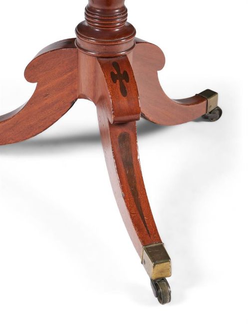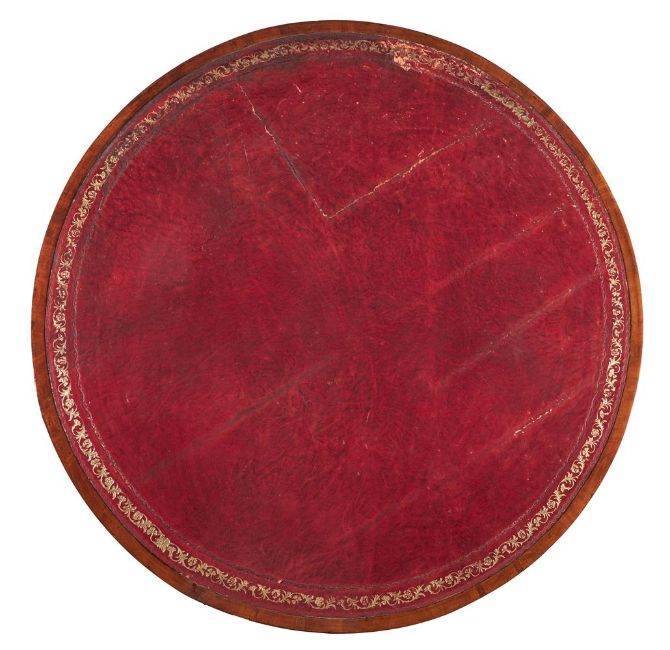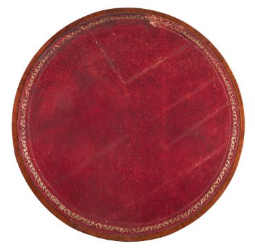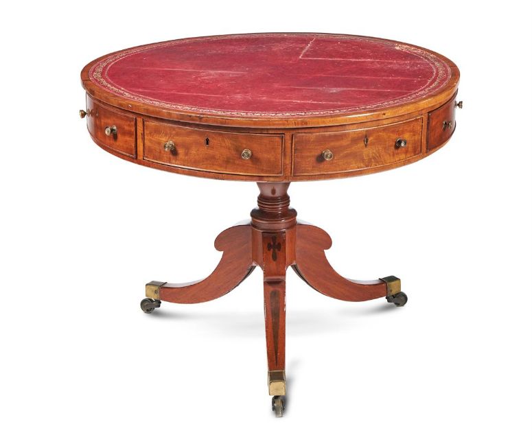 A REGENCY MAHOGANY DRUM TABLE EARLY 19TH CENTURY AND LATER The circular red leather-lined top with four frieze drawers and alternating false drawers on a turned pedestal and tripod base with brass caps and castors, restorations, the base probably later 73cm high, 92cm diameter Condition Report: Fair condition, structurally secure. There is wear and restorations to surfaces throughout. The red leather top with general wear and scuffing. Drawer pulls replaced, some backplates missing.Condition Report Disclaimer