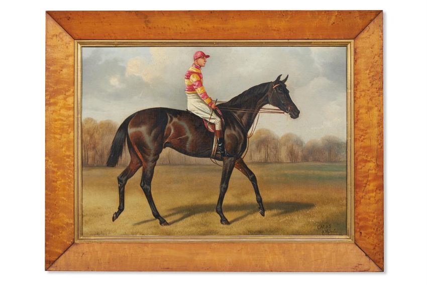 ALFRED WHEELER (BRITISH 1851 - 1932) PORTRAIT OF THE RACEHORSE 'LADAS' WITH JOCKEY UP Oil on canvas Signed and inscribed (lower right) 35.5 x 46cm (13¾ x 18 in.) Seen here in profile is the racehorse Ladas (inscribed bottom right) painted by Alfred Wheeler. Ladas was a successful British racehorse owned by Archibald Philip Primrose, 5th Earl of Rosebery. Lord Primrose - who served as Prime Minister between 1894-1895 - had an enthusiasm for horseracing, and in 1868, registered his silk colours as a hooped primrose and rose shirt set with a rose cap. Here you can see this depicted on the jockey, most likely Mr J. Watt. Ladas raced a total of eleven times and won seven, including: The 2000 Guineas Race at Newmarket and the famous Derby at Epsom.    Condition Report: The canvas has not been lined. There are a number of pin holes throughout the canvas which are visible when held up to a light. Four clustered pin-holes to the horse's tail are slightly more obvious. There is a small dent and associated small pin hole (approx. 5mm) to the tree line, below the horse's head. Inspection under UV light reveals some scattered in-filling throughout, however this has been sensitively done.Condition Report Disclaimer