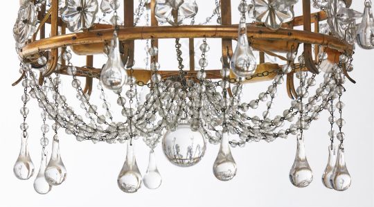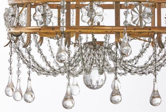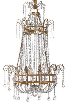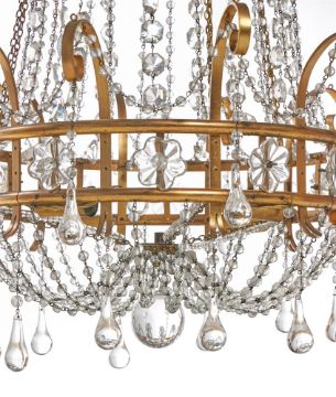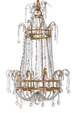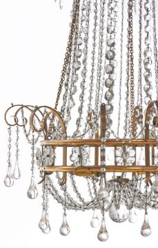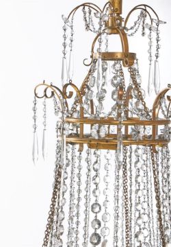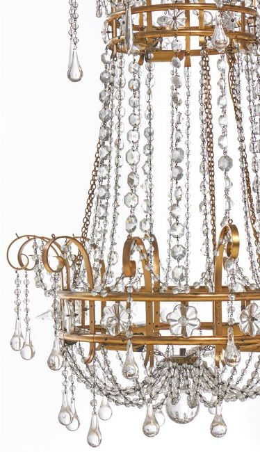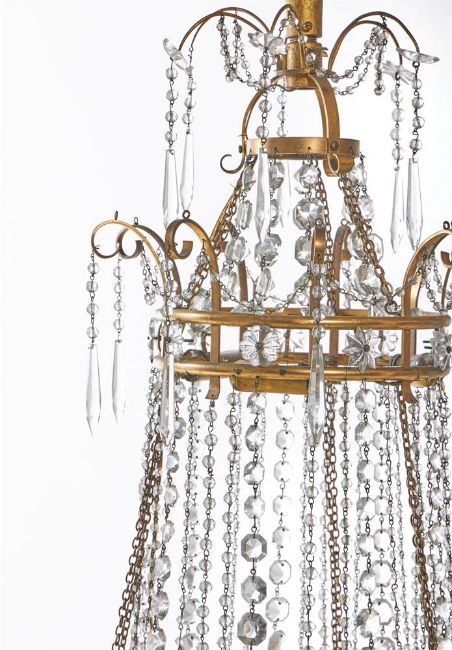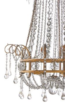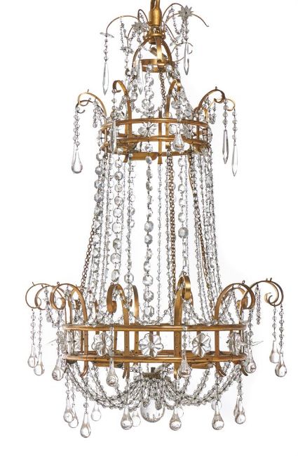 A PAIR OF GILT BRASS AND CUT GLASS LIGHT CHANDELIERS NORTH EUROPEAN, 19TH CENTURY Of tent form with scrolling branches and hung with drops each 117 x 70cm Provenance: Sale of Lady Ward, née Jean Templeton Reid (d.1962), Belgrave Square
