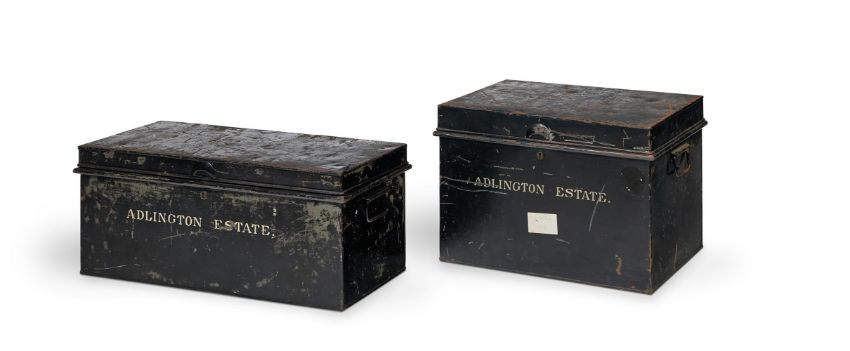 TWO BLACK PAINTED METAL ESTATE DEED BOXES 19TH CENTURY The larger, 33cm high, 77.5cm wide, 37cm deep; the smaller, 41cm high, 59cm wide, 44cm deep Condition Report: Both with significant marks, knocks, scratches and abrasions commensurate with age and use. No keys present. One lock is open, the other is locked shut. Various losses to paint and some rust in places. Please refer to additional images for visual reference to condition. Condition Report Disclaimer