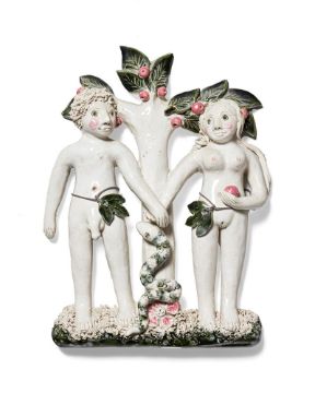 SYLVIE AURORE NISBET (1931-) ADAM AND EVE DATED 27-11-75 Polychrome glazed pottery, incised signature and date, Cheval Place Pottery, London 32cm high Condition Report: No serious damage issues noted. Please ask for images available upon request.Condition Report Disclaimer