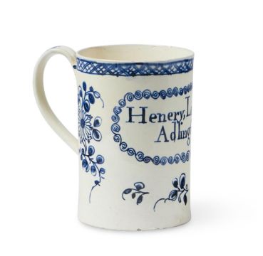 A STAFFORDSHIRE CREAMWARE BLUE AND WHITE COMMEMORATIVE MUG LATE 18TH CENTURY Inscribed 'Henery Lumows, Adlington', within a scrolling border with flower sprigs, blue 'B' mark to base 12cm high