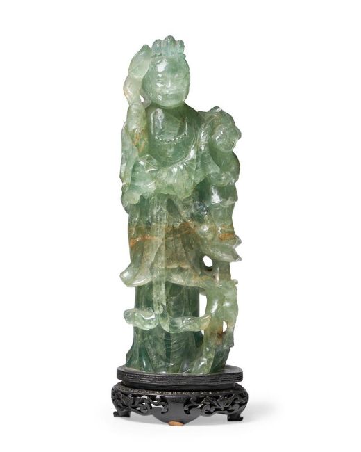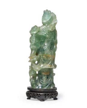 A LARGE CHINESE FLUORITE QUARTZ CARVING OF GUANGIN AND ATTENDANT 20TH CENTURY 24.5cm high, with wood stand Condition Report: stone with natural cracksCondition Report Disclaimer