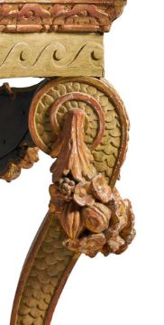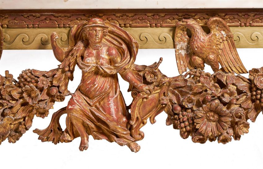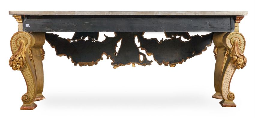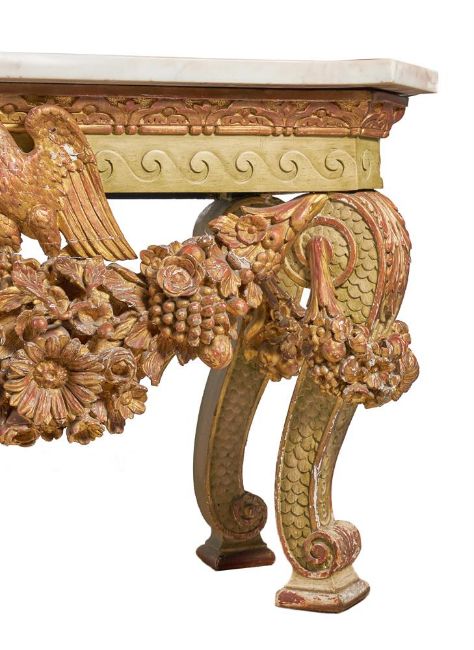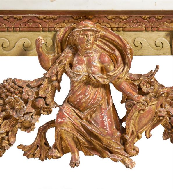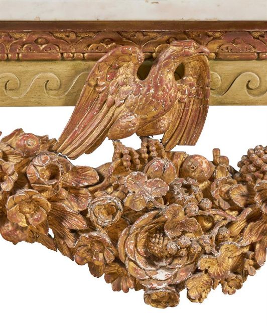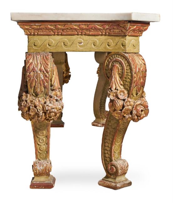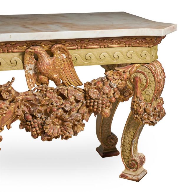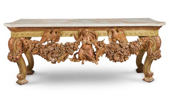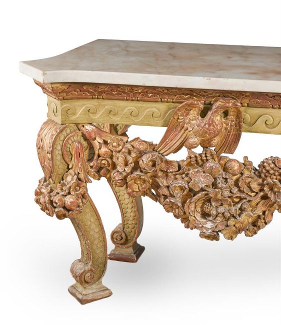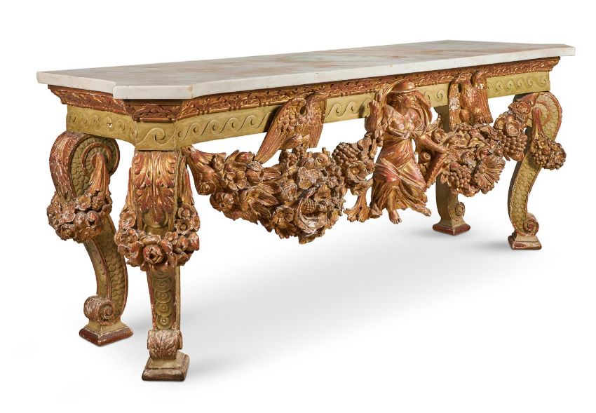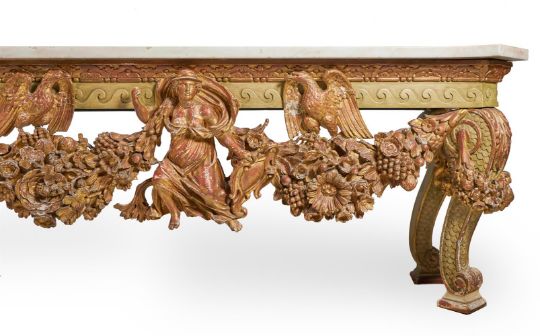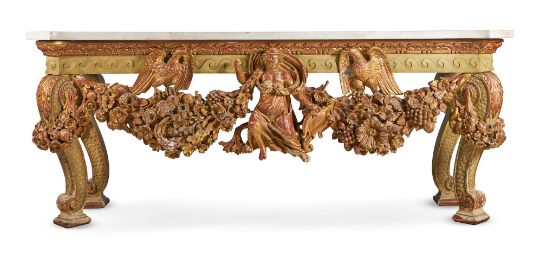 A `KENTIAN' GREY-PAINTED AND PARCEL-GILT SIDE TABLE POSSIBLY BY LENYGON & MORANT OR TROLLOPE & SONS, EARLY 20TH CENTURY The white marble top with projecting canted corners above a Vitruvian scroll frieze and elaborate apron centred by a figure, possibly Athena, flanked by eagles and floral and fruit swags on scaley and foliate swagged scroll supports 89cm high, 225cm wide, 74cm deep Provenance: Sale of Lady Ward, née Jean Templeton Reid (d.1962), Belgrave Square Lady Ward (Nee Reid) was born into a wealthy American socialite family whose father was the American Ambassador to the United Kingdom under President Theodore Roosevelt and William Howard Taft. In 1908 Lady Ward married Sir John Hubert Ward, second son of William Ward, 1st Earl of Dudley. The wedding was one of biggest Society events of the year, attended by King Edward VII and Queen Alexandra. Condition Report: Generally good, structurally secure. The marble top in good order with just a few minor edge chips, slightly discoloured in the centre. Wear, chips and larger losses to the painted and gilded decoration throughout with the red bole and white gesso visible through the wear.Condition Report Disclaimer