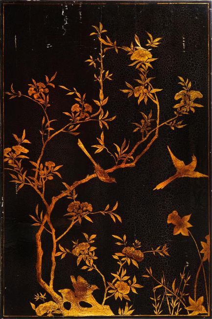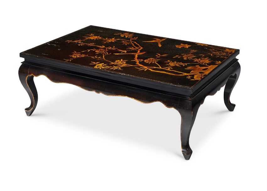 A BLACK AND GILT-JAPANNED LOW TABLE 20TH CENTURY Depicting birds on leafy branches above shaped and moulded frieze rails on cabriole legs 39cm high, 106cm wide, 70cm deep  Provenance:Loo CT et Compagnie, Rue de Courcelles Condition Report: A split running down full length through the centre, oozing and damaging to one end. Second split running all through the way in from the button of the table. Bruises and losses with ware to the edges of the legs. Overall, opening up of the craquelure and unevenness to the table surface.   Condition Report Disclaimer