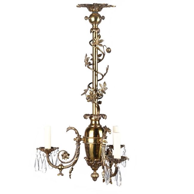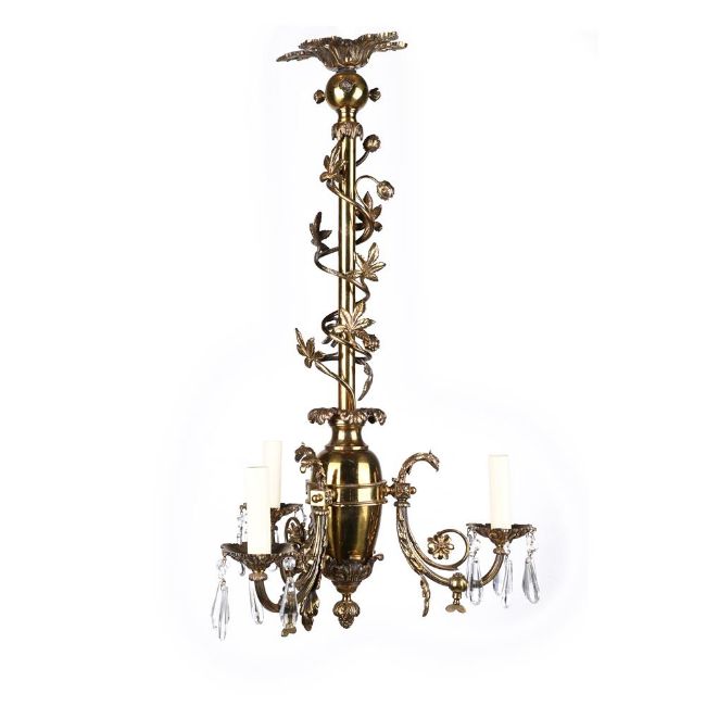 A VICTORIAN BRASS THREE LIGHT CHANDELIER SECOND HALF 19TH CENTURY 69cm high Condition Report: PLEASE NOTE: ALL LOTS IN THIS AUCTION ARE NOT AVAILABLE TO VIEW Please note the below condition report is the only one available. Some surface discolouration, see images A number of glass pendants missing This is sold as a decorative furnishing item only and not as a working electrical lighting fixture, if wished to be used as such then it would need fully wiring, testing, and installing by a professional electrician.The above report is supported with additional images which can be sent via a link. Please 'Ask a Question' to request these images. For any further enquiries please contact the department directly. PLEASE NOTE: ALL LOTS WILL BE AVAILABLE TO COLLECT FROM SACKVILLE WEST STORAGE IN ANDOVER, SP10 3SA, TWO DAYS AFTER THE AUCTION.  Condition Report Disclaimer