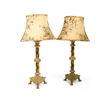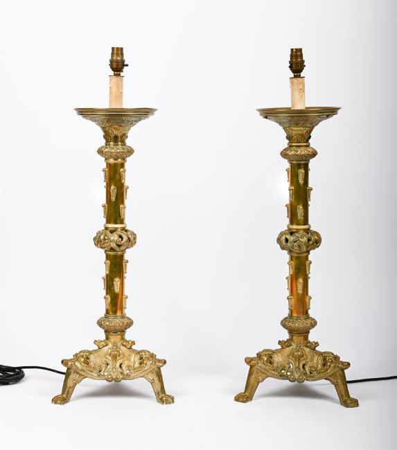 A PAIR OF POLISHED BRASS LAMPS IN CELTIC REVIVAL STYLE, 20TH CENTURY 90cm high (including shades), the bases 25cm x 22cm Condition Report: PLEASE NOTE: ALL LOTS IN THIS AUCTION ARE NOT AVAILABLE TO VIEW The below condition report is the only one available. With wear, marks, knocks and scratches as per age, handling, use, and cleaning Discolouration and pitting to brass, see imagesTwo shades includedPLEASE NOTE: This is sold as a decorative furnishing item only and not as a working electrical lighting fixture, if wished to be used as such then it would need fully wiring, testing, and installing by a professional electricianThe above report is supported with additional images which can be sent via a link. Please 'Ask a Question' to request these images. For any further enquiries please contact the department directly.PLEASE NOTE: ALL LOTS WILL BE AVAILABLE TO COLLECT FROM SACKVILLE WEST STORAGE IN ANDOVER SP10 3SA, TWO DAYS AFTER THE AUCTION. Condition Report Disclaimer