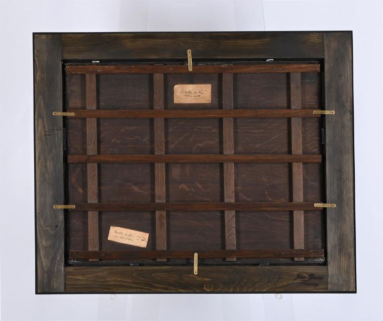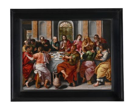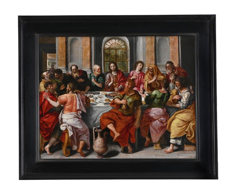 STUDIO OF MAERTEN DE VOS (FLEMISH 1532 - 1603) THE LAST SUPPER Oil on panel 56 x 67cm (22 x 26¼ in.) A dendrochronological analysis of this panel indicates that it was crafted from wood sourced from various trees in the eastern Baltic region of Europe, with a date range of approximately 1558-1590. Maerten de Vos is regarded as one of the most significant Flemish painters active between the eras of Breughel and Rubens. His work is highly eclectic, blending influences from Venetian masters like Veronese and Tintoretto - evident in the loose, swift brushstrokes used to depict drapery - with those of his Flemish contemporaries, such as Pieter Aertsen and Frans Floris. In this composition, Christ is depicted sitting among the apostles, having just announced that one of them will betray him. The painting captures their strong reactions with remarkable expression and intensity. Multiple versions of this composition exist, with the finest example held at The National Museum of Western Art in Tokyo. Condition Report: The panel has been planed flat on the reverse and is supported by a stretcher. There are fine surface cracks and frame abrasions. Under UV light there are fine scattered spots of restoration. The many of these are in a horizontal line through the centre of the image where the two planks of the panel are joined together. There are also areas of retouching in the background as well as a slightly broader area above the head of the figure on the far right. These is also retouching to the edges. It has been cleaned and revarnished. Condition Report Disclaimer