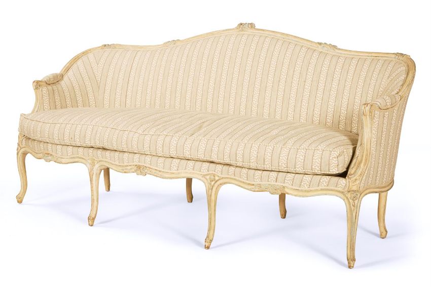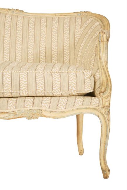 A CREAM, GREEN AND BLUE PAINTED SERPENTINE SOFA FRENCH, LATE 19TH CENTURY, IN THE LOUIS XV STYLE With Sibyl Colefax & John Fowler 'Tilney stripe' fabric upholstery 99cm high, 212cm wide, 87.5cm deep