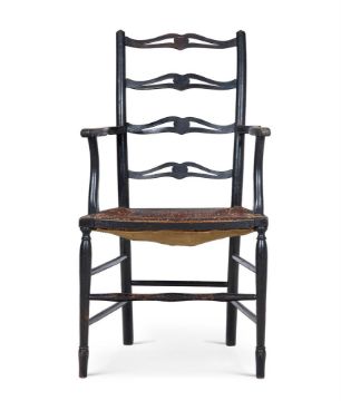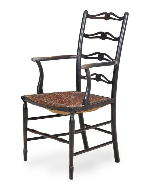 AN ARTS AND CRAFTS STAINED BEECH PIERCED LADDERBACK ARMCHAIR LATE 19TH CENTURY With stylised heart decoration to the cross-rail, and rushed seat 46cm deep, 53cm wide,102cm high Condition Report: Damage and split to the top rail Condition Report Disclaimer
