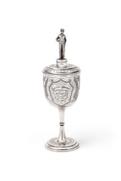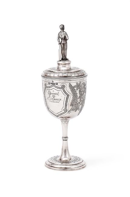 With a cricketer finial to the foliate engraved cover, the body engraved with grape vines and 'Adelaide & Suburban Cricketing Association Challenge Cup, Season 1879-80, won by The East Adelaides' and Presented T C. H. Brooks, Vice President', a knopped stem and on a circular moulded spreading foot