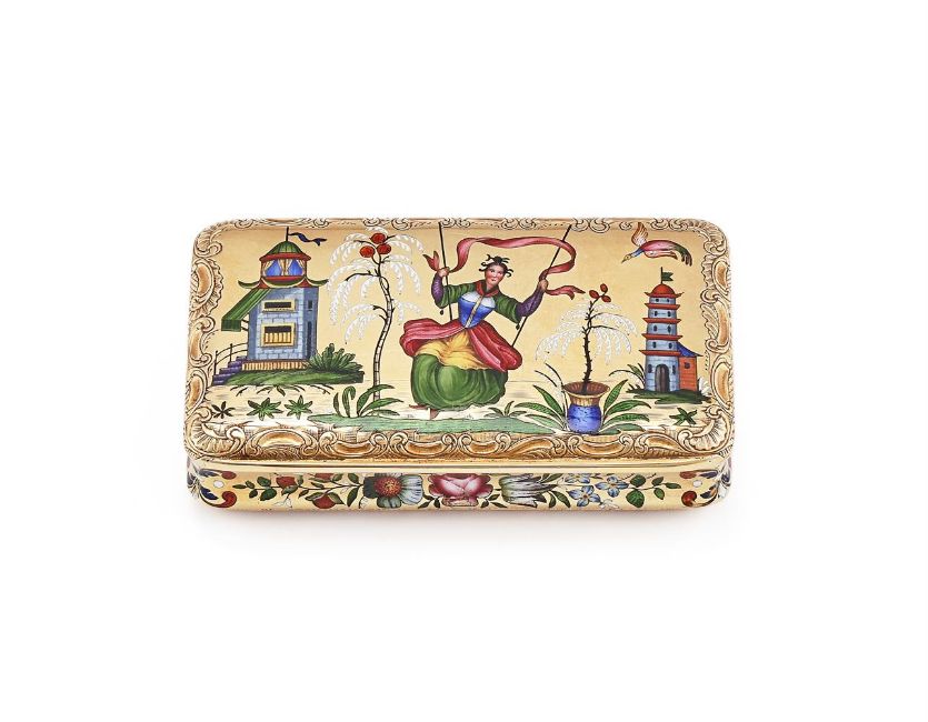 A FRENCH CHINOISERIE GOLD AND ENAMELLED SNUFF BOX JOSEPH BENJAMIN CAILLEZ, PARIS, CIRCA 1830The cover enamelled with a female figure on a swing between two pagodas, within a shell and C-scroll border, the body and base enamelled with floral sprays Size/dimensions: 6cm Gross weight: 46g Provenance: Private Collection Purchased: D. S. Lavender, London August 2003 Condition Report: Marks are clear or partially obscuredHinge goodCover closes wellEnamel generally good, a couple of minor losses to the flowers on the side of the bodyLight scratches and wear commensurate with age and use Condition Report Disclaimer
