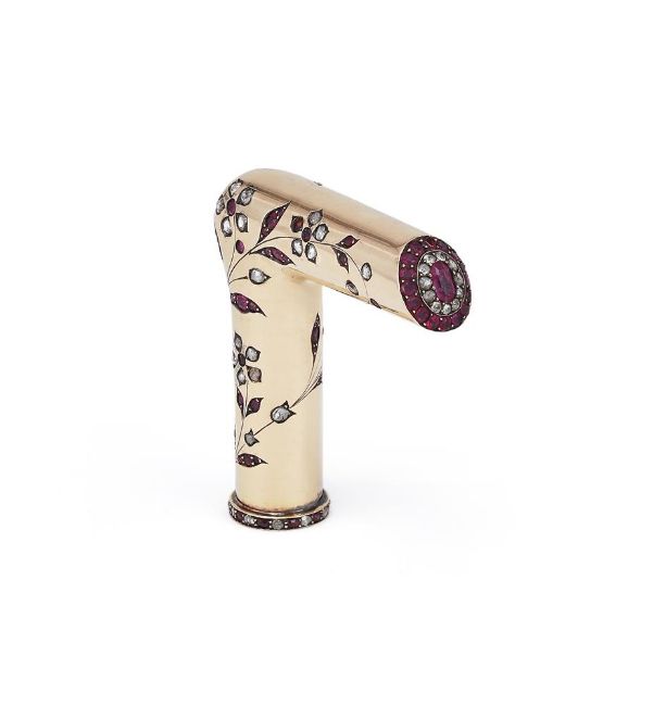 A RUBY AND DIAMOND SET PARASOL HANDLE UNMARKED Inset with ruby and diamond floral sprays and collar Size/dimensions: 6cm high Gross weight: 37gProvenance: Private Collection Condition Report: UnmarkedThe handle is gold, but has not been tested due to the destructive nature of the testAll the stone appear to be presentLight scratches and wear commensurate with age and useCondition Report Disclaimer