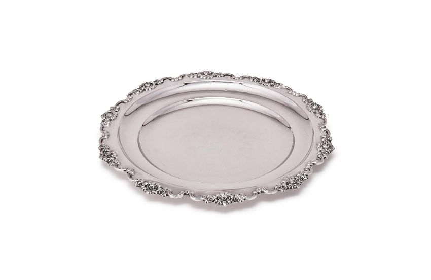 A HUNGARIAN SILVER SHAPED CIRCULAR PLATE 1937 - 1965 .900 STANDARD MARK With a chased C-scroll and flower border 30.5cm (12in) diameter 565g (18.15 oz) Provenance: The Estate of a deceased Gentleman