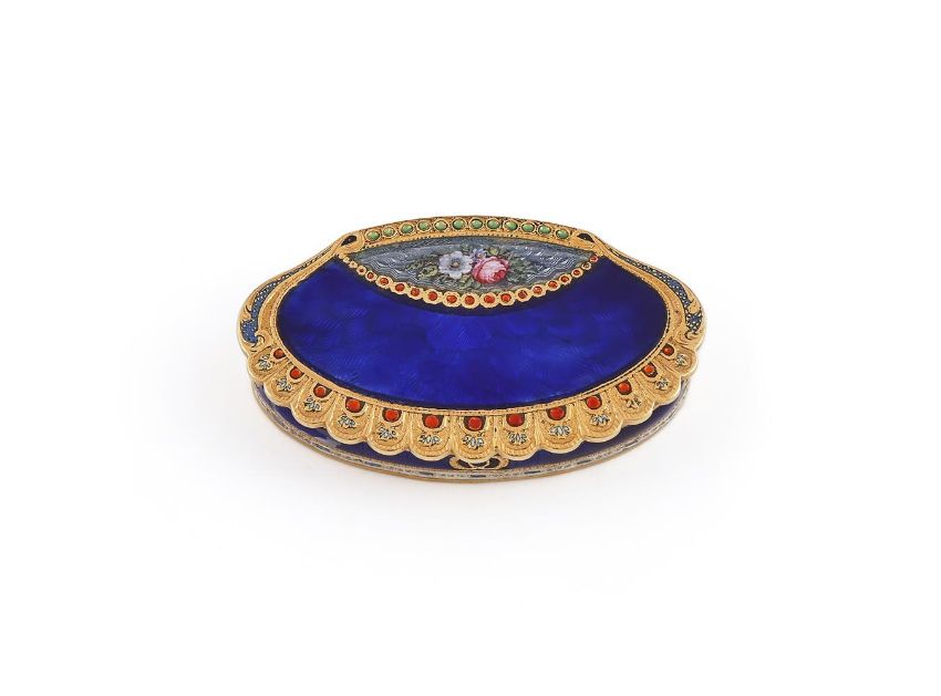 A SWISS GOLD AND ENAMELLED VINAIGRETTE GENEVA UNDER FRENCH OCCUPATION, UNIDENTIFIED MAKER'S MARK JGB, 1798 - 1809 LITTLE GUARANTEE MARK The cover enamelled with a rose and daisy to a grey ground, translucent blue enamel over peacock feather engine turned decoration and foliate chased border, opening to a pierced grill Size/dimensions: 4cm long Gross weight: 15g Provenance: Private Collection Condition Report: Maker's mark clear, other mark rubbed inside coverMark to grill clearWe are unable to confirm the carat of gold, likely to be high Bruise to the blue enamel on the side of the bodySome minor losses to the light blue enamel at the edge of the coverLight scratches and wear commensurate with age and useCondition Report Disclaimer