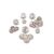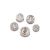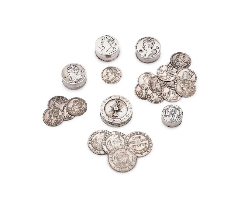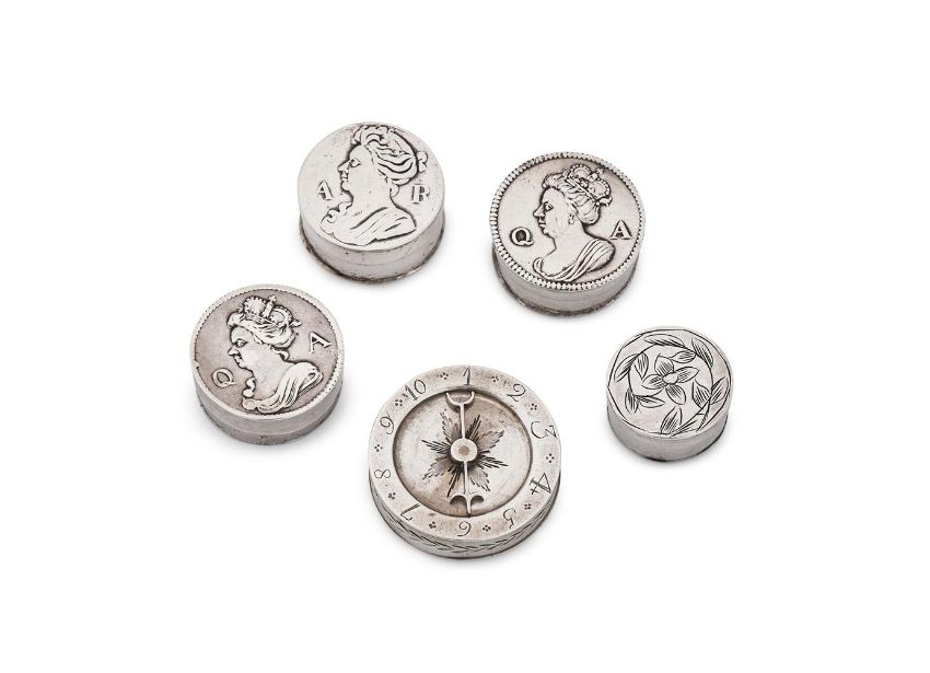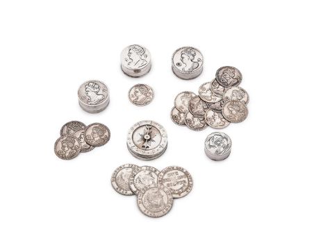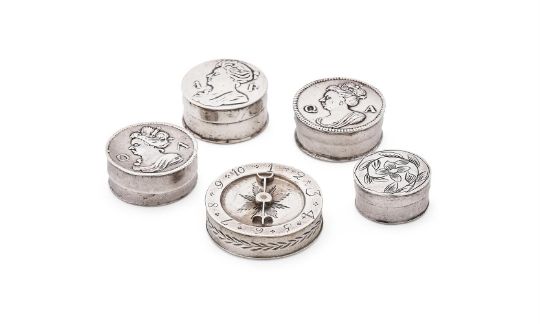To include: a Queen Anne circular box, stamped with maker's mark TK only, the cover with a portrait bust if Queen Anne between Q and A, 2.5cm (1in) diameter, with four similar tokens; another similar; a Queen Anne circular box, stamped with maker's mark ... A only, the cover with a portrait bust of Queen Anne between A and R, 2.5cm (1in) diameter, with a token; a circular box, stamped with maker's mark WP above a pellet in a heart shaped punch, the cover engraved with a foliate swag, 2cm (3/4in) diameter; and a George III circular box, maker's mark TT, Birmingham 1798, the cover with an arrow pointer 1 to 10, 3cm (1 1/4in) diameter, with four one shilling silver tokens