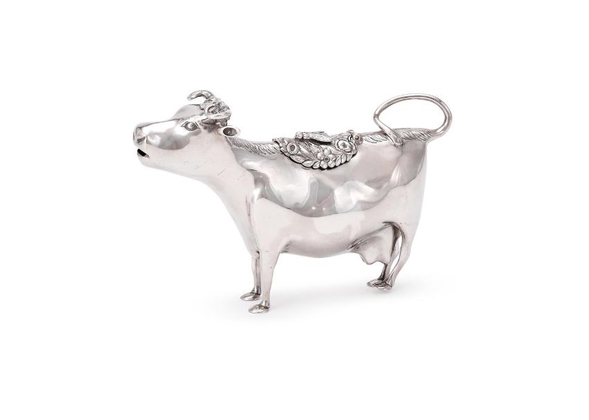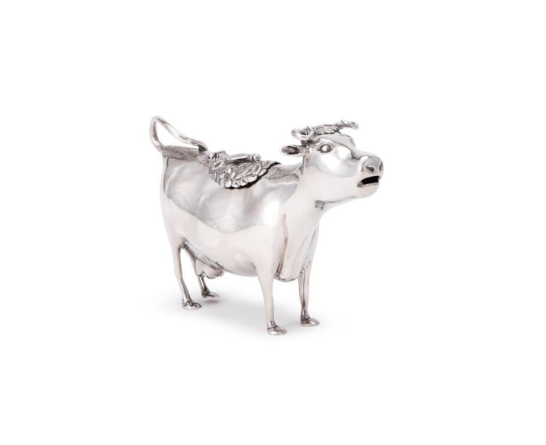 A GEORGE III SILVER COW CREAMER JOHN SCHUPPE, LONDON 1764 The floral chased cover with an applied fly 15cm (6in) long 137g (4.4 oz) Condition Report: Marks clearStands wellSlight play to the hingeNo signs of erasureLight scratches and wear commensurate with age and use Condition Report Disclaimer