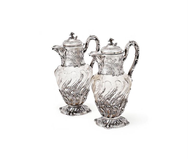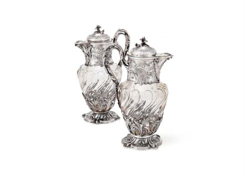 A PAIR OF FRENCH SILVER MOUNTED AND CUT GLASS CLARET JUGS EDMOND TETARD, PARIS, CIRCA 1890 With foliate finials to the domed covers, foliate scroll handles and chased with florals sprays and foliage, lobed wrythen bodies, on shaped square bases with foliate and lattice decoration 26cm (10 1/4in) high Condition Report: Claret jug 1 - Marks are clear, slight play to the hinge, cover sits well, slightly wobbles, mounts are tight to the body, minor chips to the glassClaret jug 2 - Marks partially obscured, excessive play to the hinge, cover sits well, mounts are tight to the body, glass appears to be free from hingesBoth with light scratches and wear commensurate with age and useCondition Report Disclaimer