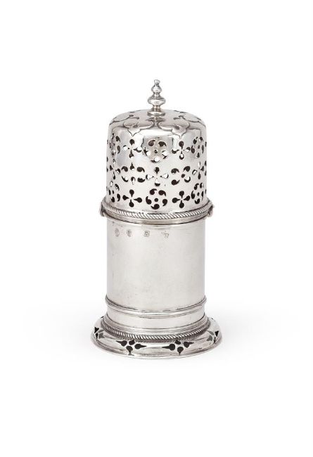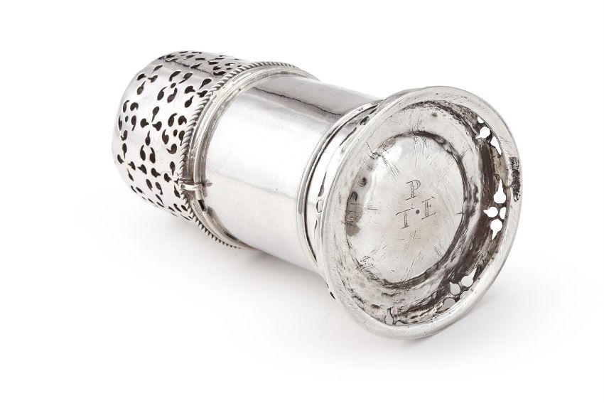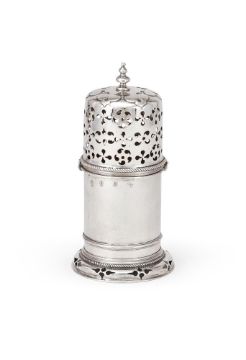 A WILLIAM III SILVER LIGHTHOUSE SUGAR CASTER POSSIBLY BY BENJAMIN BRAFORD, LONDON 1680 With a double knopped finial to the pierced cover, gadrooned bands, a girdle and on a pierced circular foot 19cm (7 1/2in) high 348g (11.2 oz) Condition Report: Marks to base partially obscuredPartial maker's mark to coverEngraving on base reads P over T.ESlightly wobblesCover fits tightly to the bodySmall split to the foliate decorationLight scratches and wear commensurate with age and use Condition Report Disclaimer