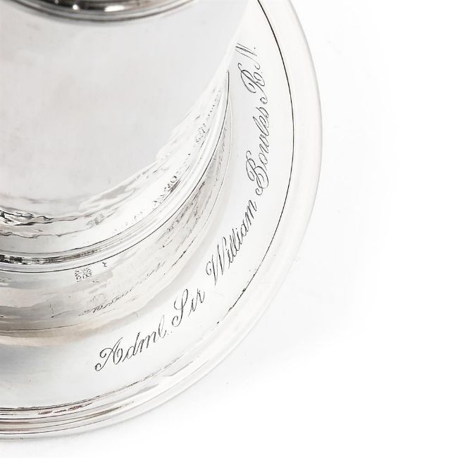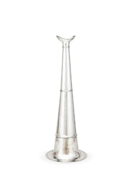 A VICTORIAN SILVER LOUD HAILER CHARLES THOMAS FOX AND GEORGE FOX, LONDON 1859 With three girdles and engraved Adml. Sir William Bowles R. N. 57.5cm (22 3/4in) high 930g (29.9 oz) Provenance: Private Collection Purchased: Tessiers, London, 8 August 1991. Stolen and recovered in 1999, subsequently repaired by S. J. Phillips, London.
