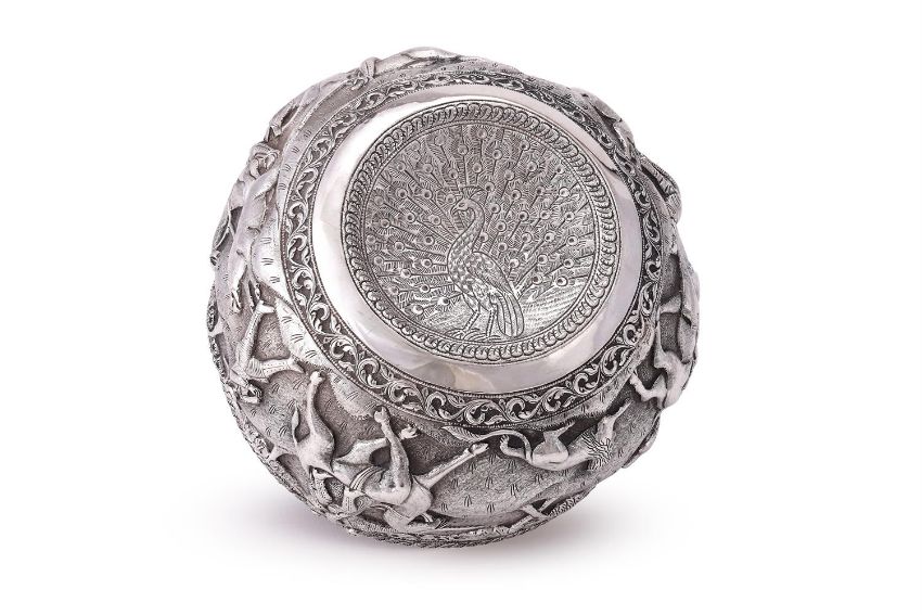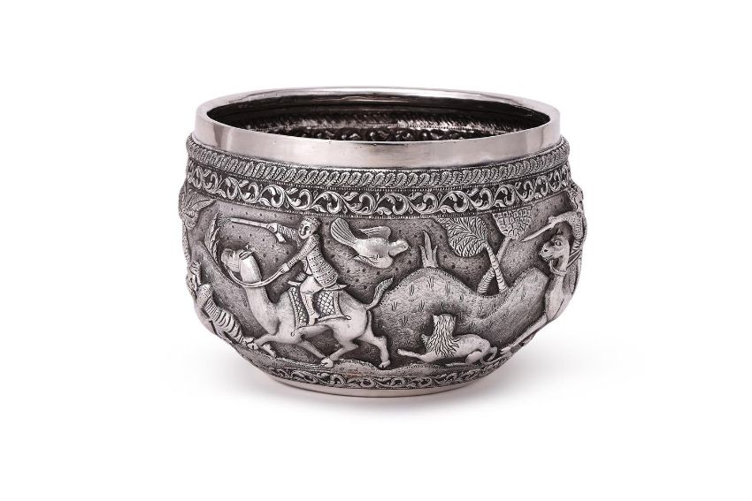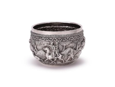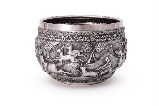 A BURMESE SILVER BOWL UNMARKED Chased with foliate bands and a hunting scene, the base engraved with a peacock 18cm (7in) diameter 634g (20.4 oz) Condition Report: Wobbles badlyDecoration in good conditionLight scratches and wear commensurate with age and use Condition Report Disclaimer