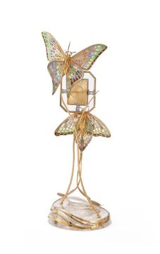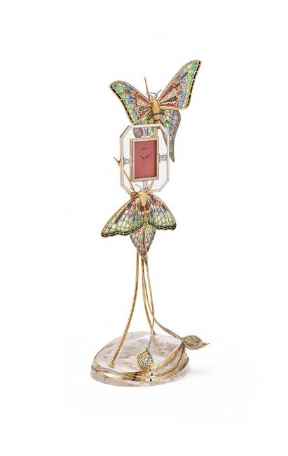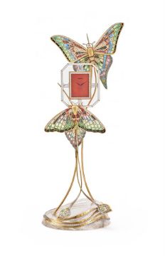 AN 18 CARAT GOLD, ENAMEL AND DIAMOND SET BUTTERFLY CLOCK ASPREY & CO. LTD., LONDON 1987 The two 18 carat gold and plique a jour enamelled butterflies set with diamonds, sapphires and rubies, to a gold mounted and diamond set rock crystal base, the clock with a pink guilloche enamel dial, diamond set bezel and Roman numerals, quartz movement, screwed down case back with four screws, mounts and dial signed Asprey 37cm high Provenance: Private Collection Condition Report: Movement not currently functioning, we have not risked opening the case back to inspect the movementEnamel goodHallmarks clearAll stones appear to be presentDial and hands goodMounts are tight to the baseRock crystal with natural inclusions and fracturesLight scratches and wear commensurate with age and use1147g grossCondition Report Disclaimer