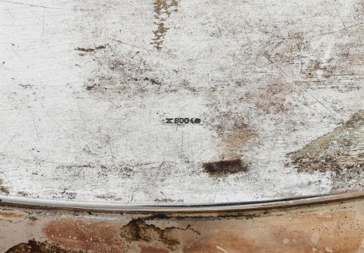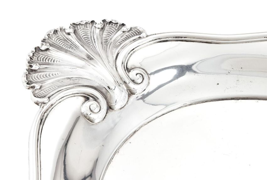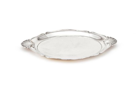 A GERMAN SILVER SHAPED OVAL TWIN HANDLED TRAY M. H. WILKENS & SÖHNE, POST 1886 .800 STANDARD With twin shell handles and a raised moulded border 61cm (24in) long 1715g (55.1 oz) Condition Report: Marks partially obscuredNo engravingLight scratches and wear commensurate with age and use, some heavier scratches to the surfaceCondition Report Disclaimer