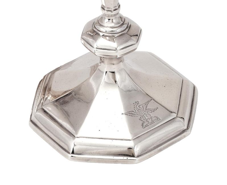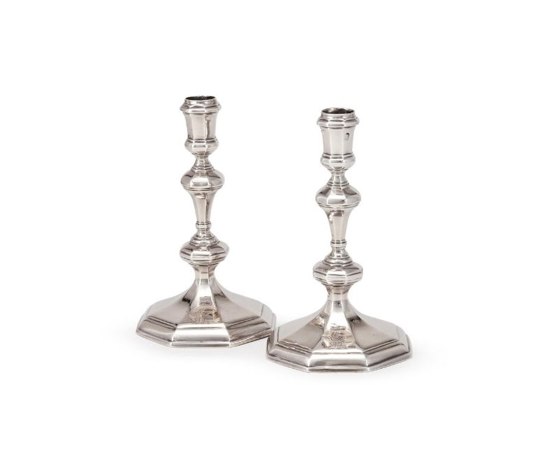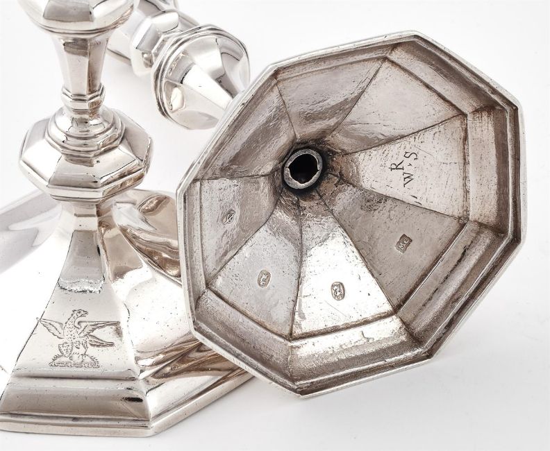 A PAIR OF QUEEN ANNE SILVER OCTAGONAL CANDLESTICKS THOMAS MERRY, LONDON 1709 With octagonal capitals, knopped stems, engraved with a crest, R over W.S beneath and on an octagonal spreading base 18cm (7in) high 612g (19.7 oz) Condition Report: Candlestick 1 - Marks are clear to base, mark to capital rubbed, stands well, crest is clear, appears to be straightCandlestick 2 - Marks are clear to base, mark to capital partially obscured, stands well, crest is clear, appears to be straightNo sconces, both with light scratches and wear commensurate with age and useCondition Report Disclaimer