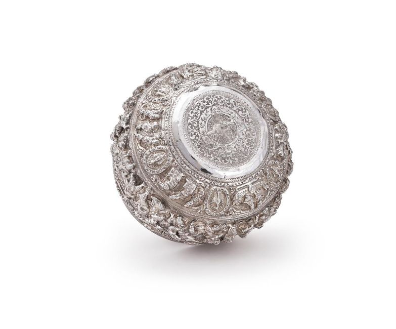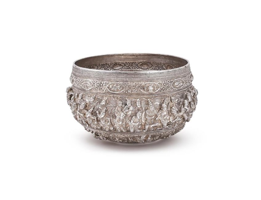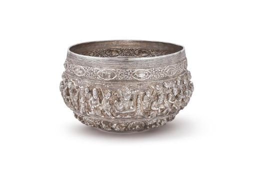 A BURMESE SILVER BOWL UNMARKED Chased with a band of the signs of the zodiac, bands of figures and birds within oval panels, the base with a winged elephant 28cm (11in) diameter 1749g (56.2 oz) Provenance: Private Collection Condition Report: WobblesDecoration in good conditionSmall dents to the baseLight scratches and wear commensurate with age and useCondition Report Disclaimer