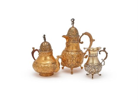 A DUTCH MATCHED SILVER GILT THREE PIECE TEA SETLATE 19TH CENTURY, .833 STANDARDThe tea pot with a figural terminal to the star and foliate chased domed cover, a wicker wrapped scroll handle, a fluted band, chased with masks, foliage and flower baskets, on a circular foot, the hot water pot similar, on three ball and claw feet, the cream jug on three scroll legs The tea pot 19.5cm (7 3/4in) long, the hot water pot 24cm (9 1/2in) high, the cream jug 12.5cm (5in) high 872g 28.05 oz) gross  Condition Report: Tea pot -Marks generally clear, gilding good to the body, gilding to the cover worn and discoloured, slight play to the hinge, wobbles, slight gap to the coverHot water pot - Marks to base clear, stands well, cover gits well, gilding good to the body, gilding to the cover worn and discolouredCream jug - Marks are partially obscured, stands well, gilding worn to highpoints of the decoration, minor knock to the rimAll with light scratches and wear commensurate with age and useCondition Report Disclaimer