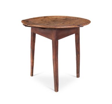 A GEORGE III WALNUT CRICKET TABLE LATE 18TH/EARLY 19TH CENTURY The circular top on three tapering chamfered legs, inscribed in chalk `GUINESS 124' 68cm high, 39cm wide  Provenance: Acquired from Christopher Gibbs, London Condition Report: Marks, knocks, scratches, abrasions consistent with age and useGood, structurally secure with wear and tear consistent with age and use. Overall good colour and patina, the top slightly dished (warped) and with localised stains adding to the charm. The top had ben re-positioned - turned 120 degrees on the triangular base and reattached with screws driven through the top and into the three legs.Various old woodworm holes, some filler to repair old losses Please see additional images for visual reference to condition Condition Report Disclaimer