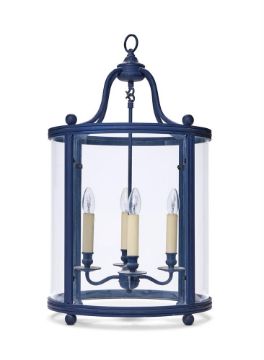 A BLUE PAINTED METAL DRUM HALL LANTERN MODERN Ball finials and glass inset panels approximately 76cm high, 43cm diameter   Condition Report: With wear, marks, knocks and scratches as per age, handling, use, and cleaning. Some surface dirt- mild wear from handling ELECTRICAL GOODS. These are sold as decorative items only and if bought for use must be checked over for compliance with safety regulations by a qualified electrician before use. Please see additional images for visual references to condition which form part of this condition report. All lots are available for inspection and Condition Reports are available on request. However, all lots are of an age and type which means that they may not be in perfect condition and should be viewed by prospective bidders; please refer to Condition 6 of the Conditions of Business for Buyers. This is particularly true for garden related items. All lots are offered for sale "as viewed" and subject to the applicable Conditions of Business for Buyer's condition, which are set out in the sale catalogue and are available on request. Potential buyers should note that condition reports are matters of opinion only, they are non-exhaustive and based solely on what can be seen to the naked eye unless otherwise specified by the cataloguer. We must advise you that we are not professional restorers or conservators and we do not provide any guarantee or warranty as to a lot's condition. Accordingly, it is recommended that prospective buyers inspect lots or have their advisors do so and satisfy themselves as to condition and accuracy of description. If you have physically viewed an item for which you request a report, the condition report cannot be a reason for cancelling a sale. Buyers are reminded that liability for loss and damage transfers to the buyer from the fall of the hammer. Whilst the majority of lots will remain in their location until collected, we can accept no responsibility for any damage which may occur, even in the event of Dreweatts staff assisting carriers during collection. Condition Report Disclaimer