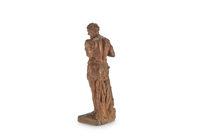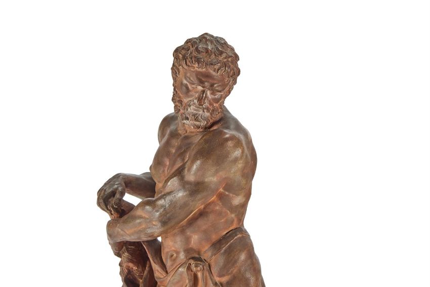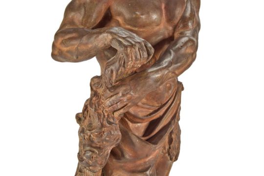 ATTRIBUTED TO LAURENT DELVAUX (1696-1778) A TERRACOTTA FIGURE OF HERCULES EARLY/MID 18TH CENTURY Terracotta on an integrally modelled square base, inscribed '24397' to paper label to underside 54cm height Provenance: Acquired from Tajan, Paris, 13th December 2006, lot 93 J. Kugel, Paris, 2007 Literature: F. Haskell and N. Penny, Taste and the Antique - The Lure of Classical Sculpture 1500-1900 , New Haven and London, 1981, pp. 229-232, no. 46. This work attributed to Laurent Delvaux would seem to draw its inspiration from the 2nd century AD Roman marble figure of Hercules discovered in the Baths of Caracalla in Rome by 1556 and was acquired by Pope Paul III Farnese. Subsequently held in the Museo Nazionale, Naples, the "Hercules Farnese" was the inspiration for various work by Delvaux depicting Hercules at rest and it is likely that he studied the original figure at first hand during his trip to Rome in 1728. Of his depictions perhaps the best known is the life-size marble statue for Lord Castlemaine made in around 1722 and which is now housed in Waddesdon Manor, England. In this example the sculptor has shifted the composition to present a less static figure, the tree moved behind the figure and leg positions switched over to echo the diagonal line now established by the left arms reaching across the body. Condition Report: Please note- cataloguing should read "inscribed '24397' to paper label to underside" With wear, marks, knocks and scratches as per age, handling, use, and cleaning. The whole with contact marks and surface dirt from handling. Small section of sticky tape residue to bottom of spine. When sold at Tajan it was catalogued with restorations. Visible old restorations to left arm above elbow, left and right wrists, section of right arm and under right hand. Further remedial works probably to neck and to some raised elements. Under UV later remedial painted spot retouchings to surface throughout which from different colours seem to be from a variety of ages. Firing faults visible to underside. Please see additional images for visual references to condition which form part of this condition report. All lots are available for inspection and Condition Reports are available on request. However, all lots are of an age and type which means that they may not be in perfect condition and should be viewed by prospective bidders; please refer to Condition 6 of the Conditions of Business for Buyers. This is particularly true for garden related items. All lots are offered for sale "as viewed" and subject to the applicable Conditions of Business for Buyer's condition, which are set out in the sale catalogue and are available on request. Potential buyers should note that condition reports are matters of opinion only, they are non-exhaustive and based solely on what can be seen to the naked eye unless otherwise specified by the cataloguer. We must advise you that we are not professional restorers or conservators, and we do not provide any guarantee or warranty as to a lot's condition. Accordingly, it is recommended that prospective buyers inspect lots or have their advisors do so and satisfy themselves as to condition and accuracy of description. If you have physically viewed an item for which you request a report, the condition report cannot be a reason for cancelling a sale. Buyers are reminded that liability for loss and damage transfers to the buyer from the fall of the hammer. Whilst the majority of lots will remain in their location until collected, we can accept no responsibility for any damage which may occur, even in the event of Dreweatts staff assisting carriers during collection.Condition Report Disclaimer