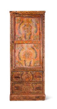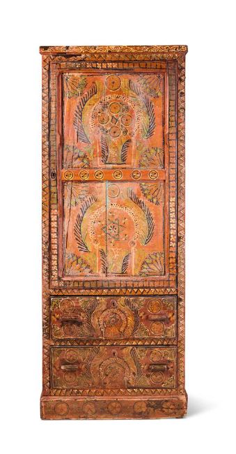 A POLYCHROME DECORATED FREESTANDING WOODEN CUPBOARD POSSIBLY MOROCCAN, 19TH CENTURY OR RE-USING OLD ELEMENTS Displaying flowers and foliage on a red ground, with a panelled door and two drawers below 171cm high, 67cm wide, 50cm deep Condition Report: Marks, knocks, scratches, abrasions consistent with age and use,Generally good, structurally secure, with wear and tera consistent with age and use. There are splits to the door panels and some of the painted decoration lifting. Slight shrinkage to the joints. The door reveals two internal shelves - one supporting timber rail is loose Some signs of refreshment to the painted surfaces Old splits and cracks, chips and losses, scratches, dirt and discolouration to the surfaces from age and use in a domestic setting, also surface marks and stainsThe lock escutcheon is detached but present, all locks with surface corrosion, there is one key present but the locks appear to be seized and not operating at time of report Please see additional images for visual reference to condition   Condition Report Disclaimer