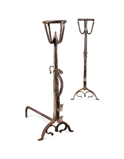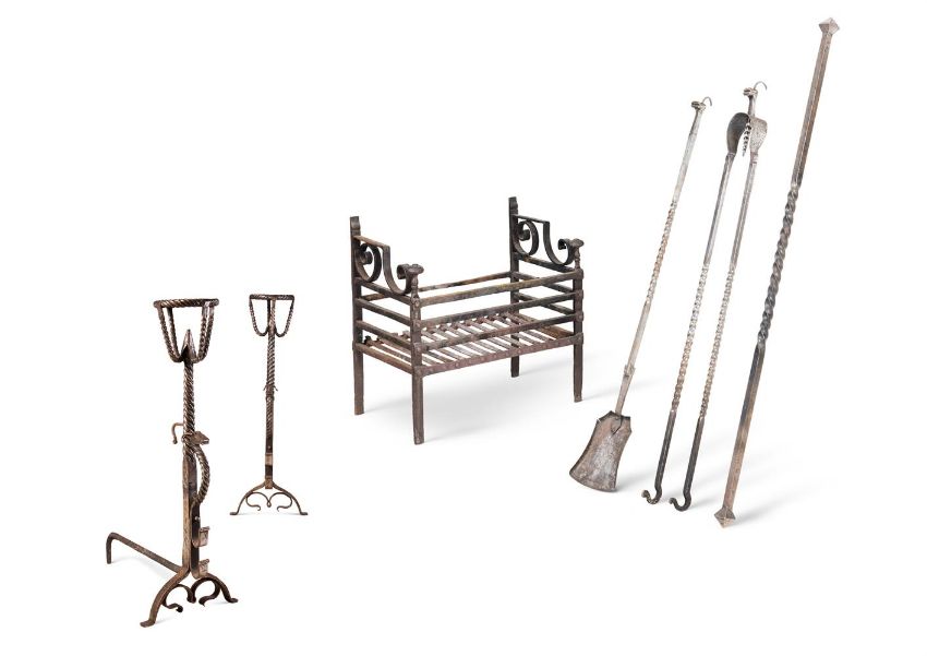 A WROUGHT IRON FIRE BASKET EARLY 20TH CENTURY With scroll bracket ornament above the slatted body 48cm high, 49cm wide, 31cm deep Together with a set of fire irons 100cm long And a pair of andirons, 91cm high, 60cm deepSALEROOM NOTICE: Please note this lot comes with a pair of andirons, please see updated cataloguing.