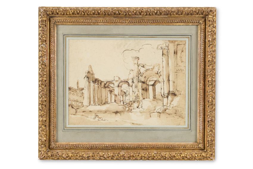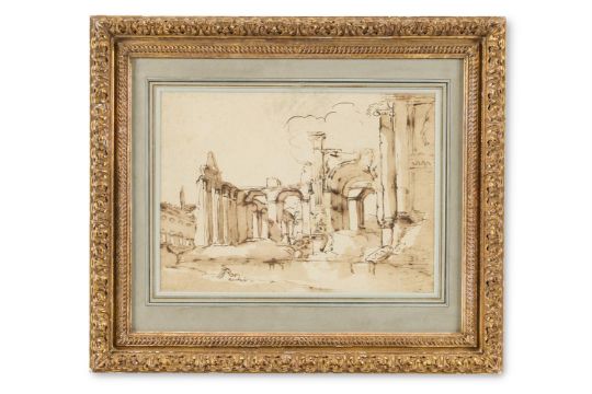 ITALIAN SCHOOL (18TH CENTURY) STUDY OF CLASSICAL RUINS Pen and ink on paper 19 x 26.5cm (7¼ x 10¼ in.) Condition Report: Unexamined out of glazed frame. There is a crease in the paper along the upper edge and less prominent horizontal crease approximately 6cm from the upper edge. The paper presents a small horizontal crease, approximately 2cm long, in the upper right corner. Surface dirt throughout. Light foxing is present, most notably to the upper left quadrant. There is a small blue stain along the upper right edge. Condition Report Disclaimer