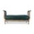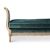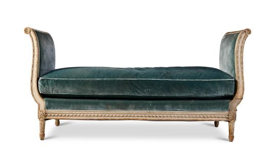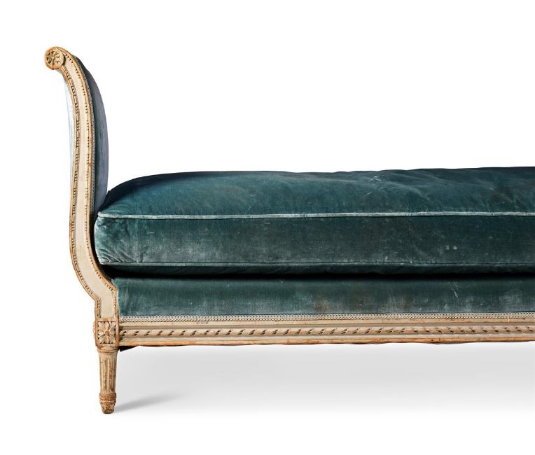 A LOUIS XVI STYLE PALE GREEN PAINTED AND BLUE VELVET UPHOLSTERED RECAMIER 19TH CENTURY With shaped, panelled ends and a loose cushion above ribbon-twist rails with rosette blocks, on tapering turned and fluted legs, labelled `L'Atelier des Etoffes, PARIS 7EME' 83cm high, 173cm wide, 72cm deepProvenance: Acquired from O. F. Wilson, London Condition Report: Fair condition, with marks, knocks, scratches, abrasions, signs of wear and tear consistent with age and use. The upholstery is in good condition but would certainly benefit from a gentle clean. The scroll end with the reclining action has previously been broken in its joints with the rectangular base, - this has been repaired by a restorer recently. The paintwork and legs a bit worn and scuffed as to be expected. The upholstery with wear and tear generally as well as marks, stains, generally unevenness, may well suit a full reupholsterPlease see additional images for visual reference to condition Condition Report Disclaimer