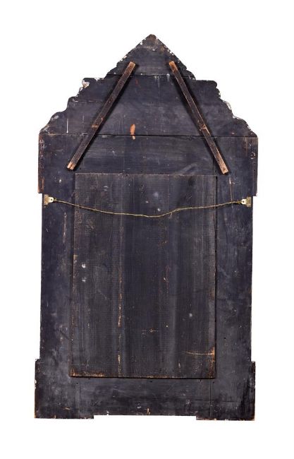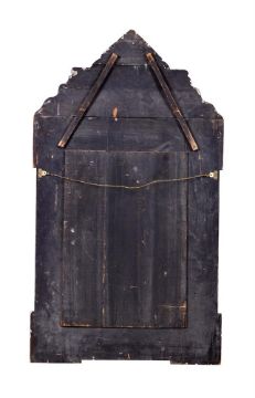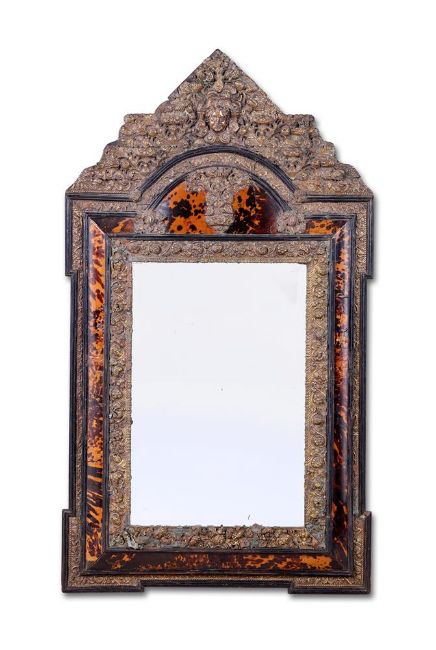 Y  A NORTH EUROPEAN TORTOISESHELL, REPOUSSE BRASS AND EBONISED MIRROR 19TH CENTURY The rectangular bevelled plate in a cushion surround with bands of flowers of foliage, the triangular pediment centred by a female mask 147cm high, 84cm wide  Provenance:Acquired from Robert Kime Condition Report: Generally good, structurally secure, with wear and tear consistent with age and use. The tortoiseshell is in in good order, some small losses and shrinkage to the ebonised mouldings, the (very thin) repousse metal with some small losses, dents and areas of corrosion. The mirror is in good order and unmarked. Condition Report Disclaimer