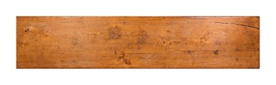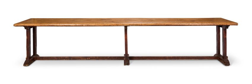 AN OAK TRESTLE TABLE 19TH CENTURY, POSSIBLY INCORPORATING EARLIER ELEMENTS The plank top above end supports united by stretchers 70cm high, 338cm long, 72cm wide Provenance: Acquired from Robert Young Antiques, London Condition Report: Marks, knocks, scratches, abrasions consistent with age and useThe top is formed of two long planks above a high rail (which is formed of shorter lengths, this appears to have had brackets previoiusly to the underside and later removed (there are areas of lighter timber where these appear to have had brackets, the long lower rail appears to be one long length - this does appear later than the surrounding timber supports and struts - the rail also protrudes from the ends of the base Various chips and losses, scratches, abrasions, the top surface with a near central large water mark and loss to the polish, there are also scratches and indentations to the top from age and use in a domestic setting Please see additional images for visual reference to condition and appearance Condition Report Disclaimer