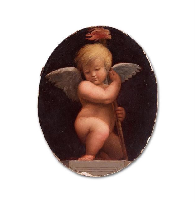 AFTER RAFFAELLO SANZIO, CALLED RAPHAEL CHERUB WITH TORCH Oil on panel 15.2 x 12cm (5 x 4½ in.) Unframed After the fresco in Santa Maria della Pace, Rome Condition Report: The panel presents various damages to the edges most notable to the lower edge, as well as to the upper right edge. UV light reveals an unevenly applied varnish but no evident signs of retouching. Condition Report Disclaimer