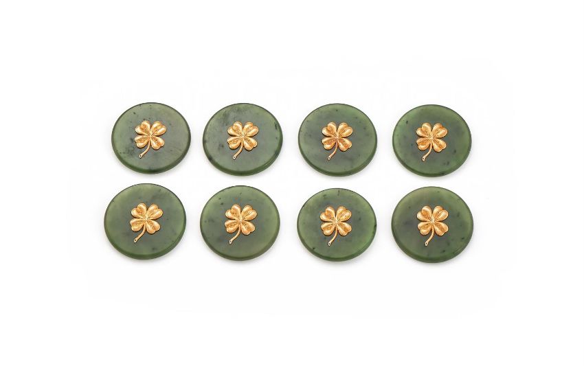 FABERGÉ, A BOXED SET OF EIGHT NEPHRITE AND GOLD GAMING TOKENS ST. PETERSBURG, CIRCA 1900 Each polished nephrite disc applied with a gold four leaf clover, within a fitted silk and velvet lined holly wood case, tokens appear unmarked Size/dimensions: 2.8cm diameter each Gross weight: tokens 46.8 grams totalProvenance: Private Collection Sale, Sotheby's New York 'Russian Art' 22nd April 2010 Lot 78 Condition Report: The box has general wear as commensurate with age and use. The lining to the lid stamped in Cyrillic beneath the Imperial warrant Fabergé, St. Petersburg, Moscow, OdessaThe gaming tokens have scuffs and scratches particularly to the bases from use, the clovers appear well attached at the time of cataloguing, some very slight rubbing to high relief. Condition Report Disclaimer