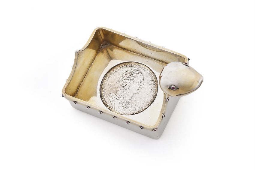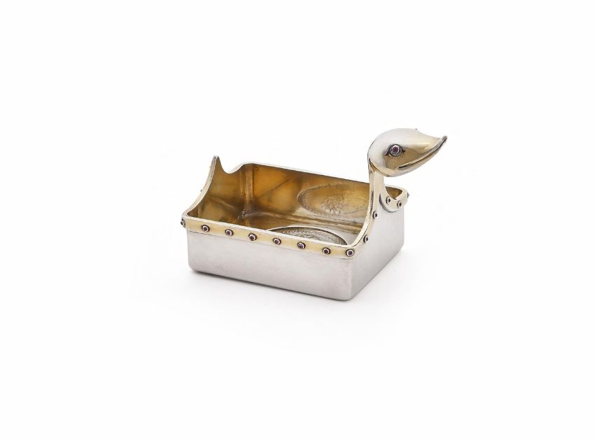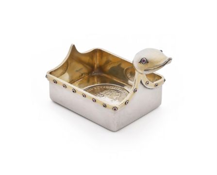 FABERGÉ, A RUBY SET SILVER AND SILVER GILT KOVSH WORKMASTER JULIUS RAPPOPORT, CIRCA 1890 The shaped rectangular bowl with a stylized duck's head shaped handle with cabochon ruby eyes, with similarly ruby set band around the rim and raised prow, the base set with a one rouble coin depicting Peter the Great dated 1724, marked under base with 'Fabergé' in Cyrillic and workmaster initials JR in Cyrillic, 88 standard Size/dimensions: 9.0cm long Gross weight: 190.2 gramsProvenance: Private Collection Purchased from Wartski, December 1997 Condition Report: Gilding worn throughout. Scratches and nicks and a small gouge to rear corner. Tail slightly bent. Some rubbing and abrasion to rubies. Lightly scratched number 1949A. Condition Report Disclaimer