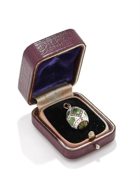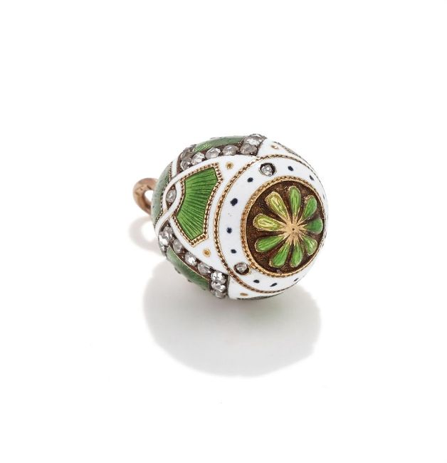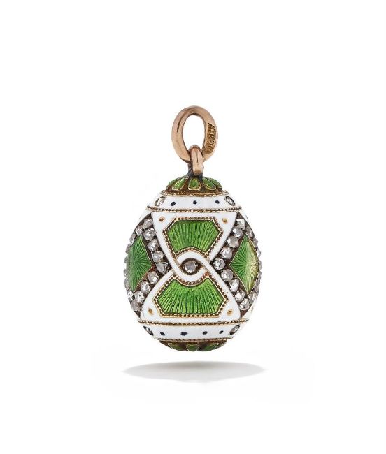 FABERGÉ, A GEM SET ENAMEL EGG PENDANT WORKMASTER MICHAEL PERKHIN, ST. PETERSBURG 1898-1903 Decorated with green guilloché enamel panels within opaque white enamel and rose cut diamond borders, struck with workmaster marks MP in Cyrillic, 56 standard Size/dimensions: 2.6cm including bale Gross weight: 8.0 gramsProvenance: Private Collection Sale, Sotheby's New York, 23rd October 2014, lot 42 Condition Report: Some chips to white enamel and light surface wear to enamel throughout, black solder near loop. Condition Report Disclaimer